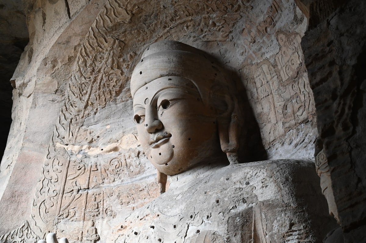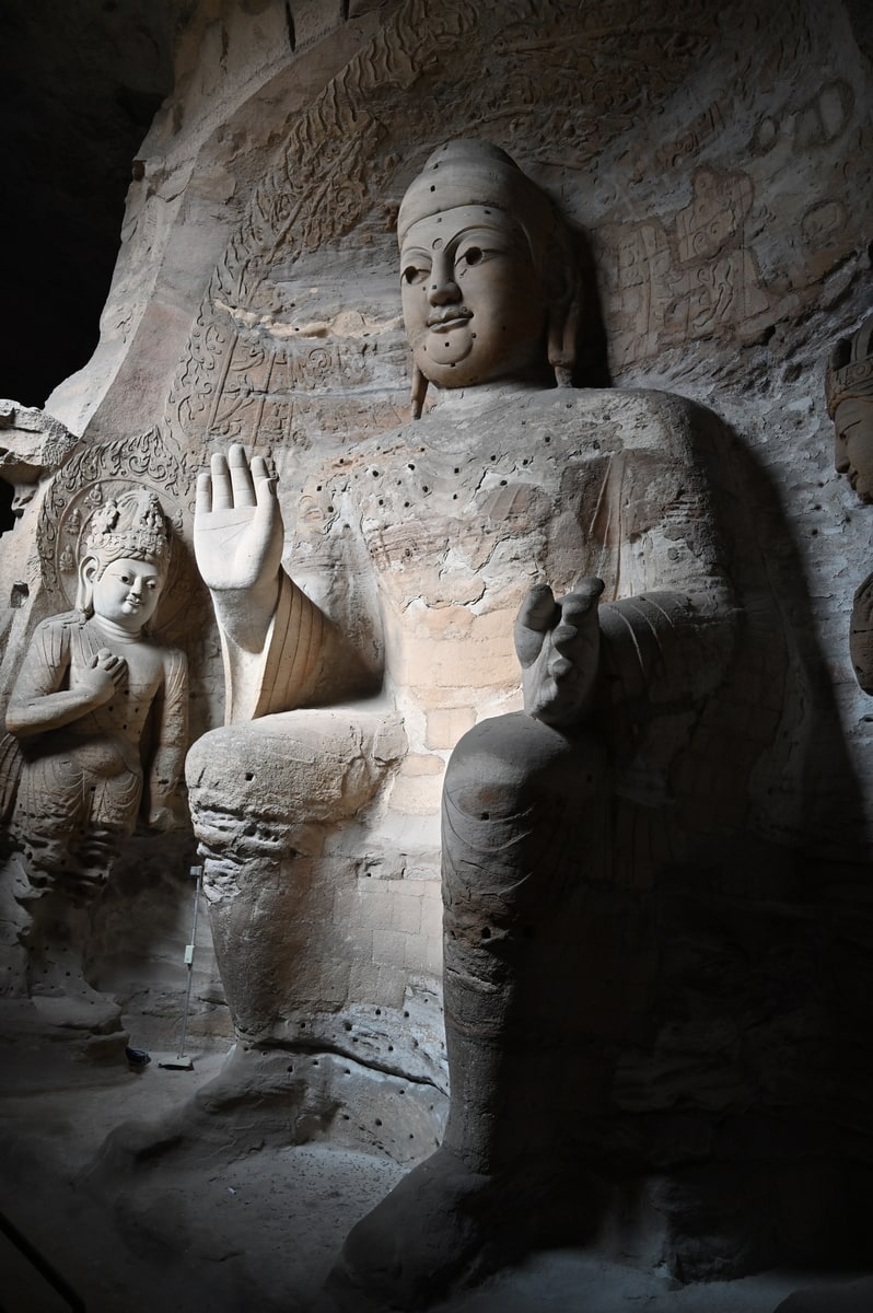 雲岡石窟が造営されたのは北魏時代。北魏398年、道武帝の時代に都を平城に定めた。平城は現在の大同市の北部にあった。時の皇帝は仏教復興を盛んにし、仏像彫刻に力を入れ、高僧、譚瑶の指導のもと、武州山の山腹に5つの洞窟が掘られた。