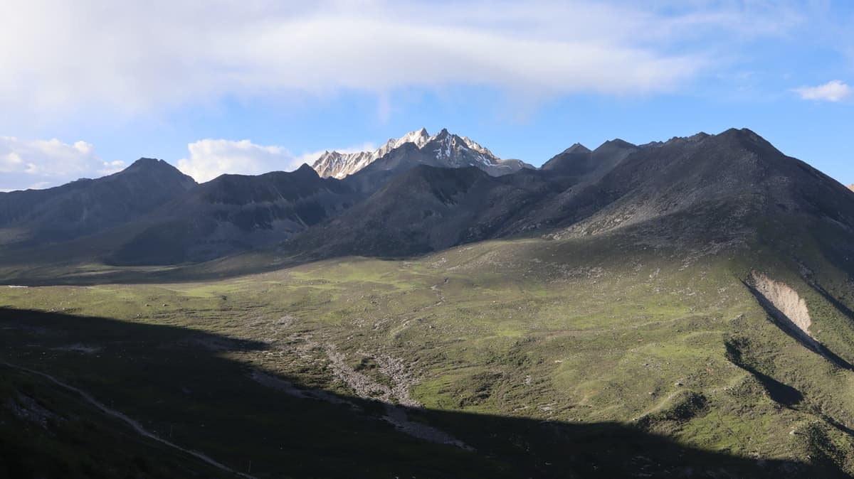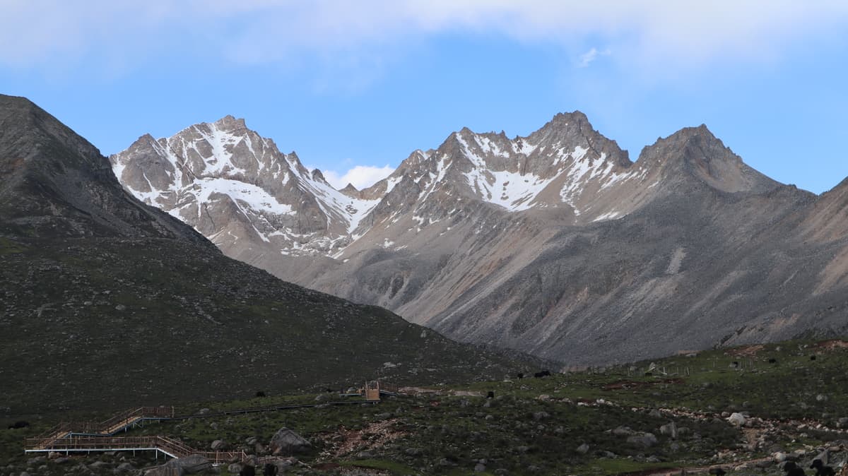 甲玉拉措を後に玉科草原を通り道フの街に向かう。道路は標高4,000mを超える道で、途中、多杰玉崇神山(トゥジィェユツォン神山)峠を通る。多杰玉崇神山は党嶺山脈に属する標高5,556mのチベット族が信仰する雪山。峠の標高は4,400mほどで壮大な景色が続く。