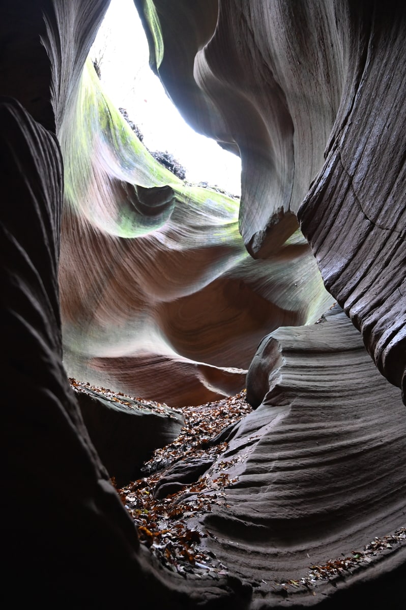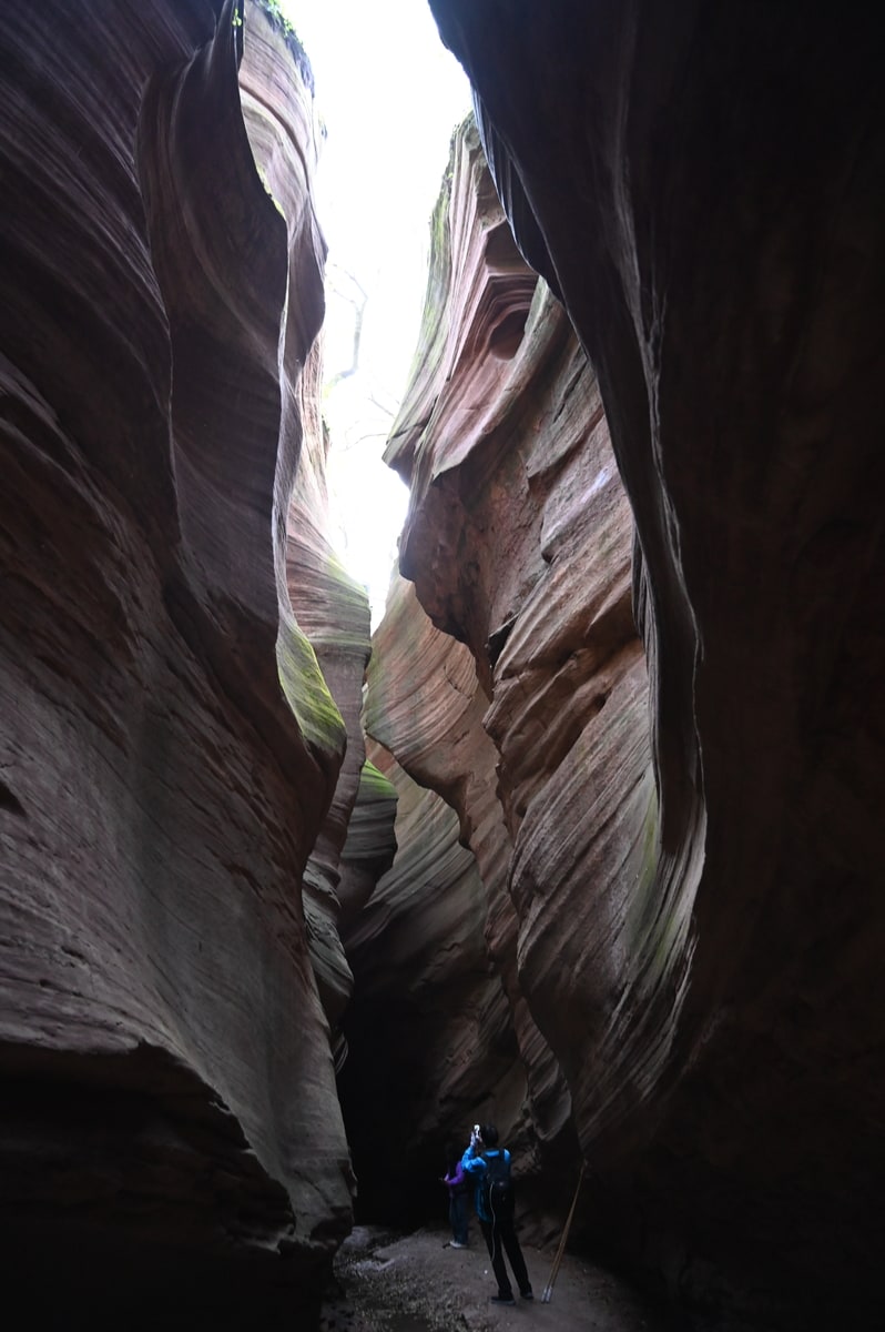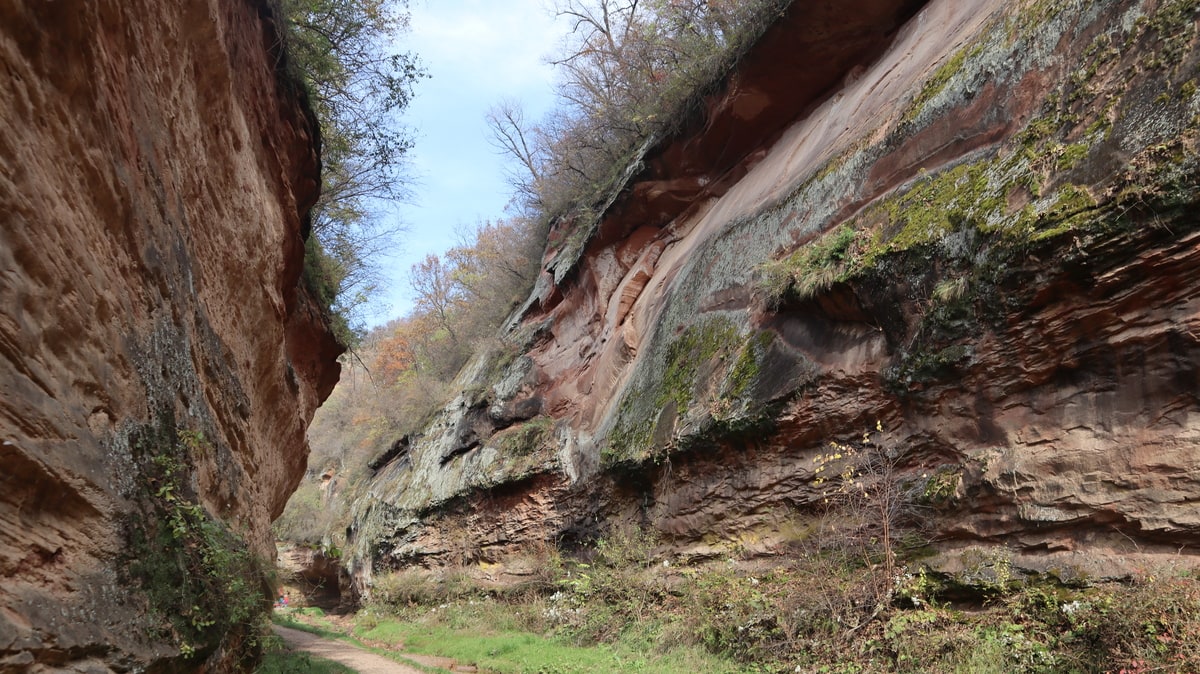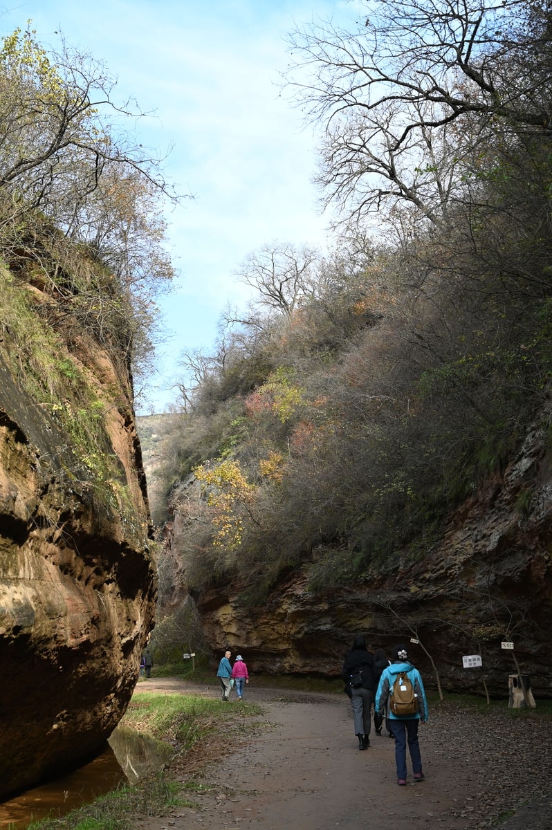 紅葉の甘泉峡谷を歩いた。両側の岩山の隙間から秋の陽ざしが差し込み、岩を照らしている。侵食され削られて丸くカーブを描く岩に微妙な色彩の太陽光が反射している。