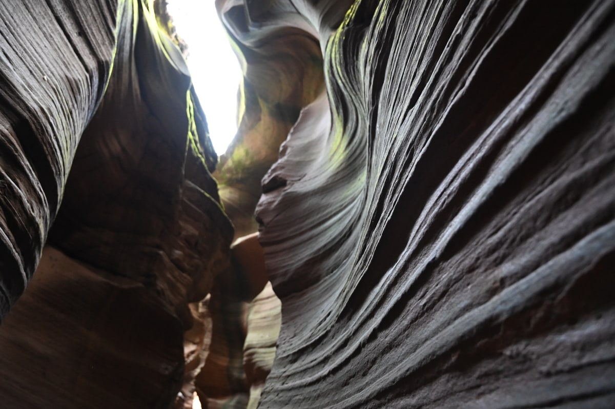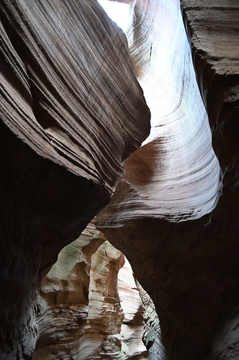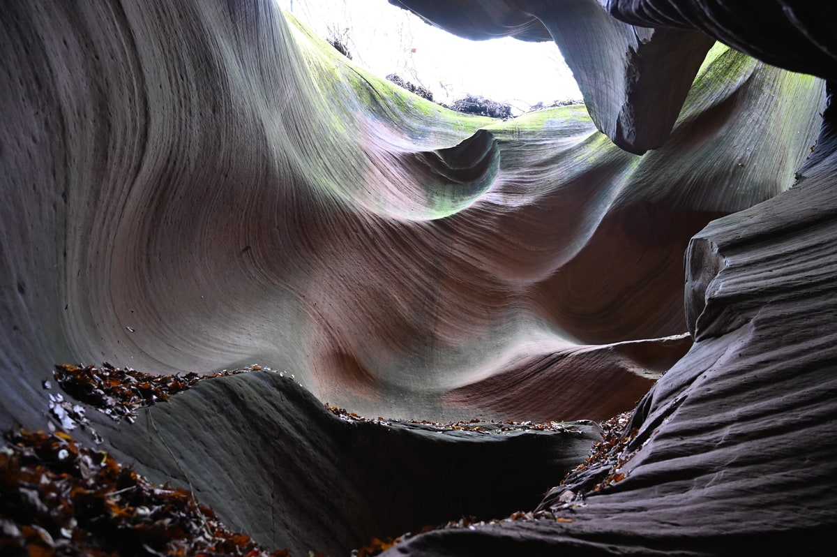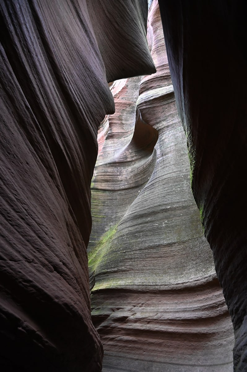 紅葉の甘泉峡谷を歩いた。両側の岩山の隙間から秋の陽ざしが差し込み、岩を照らしている。侵食され削られて丸くカーブを描く岩に微妙な色彩の太陽光が反射している。