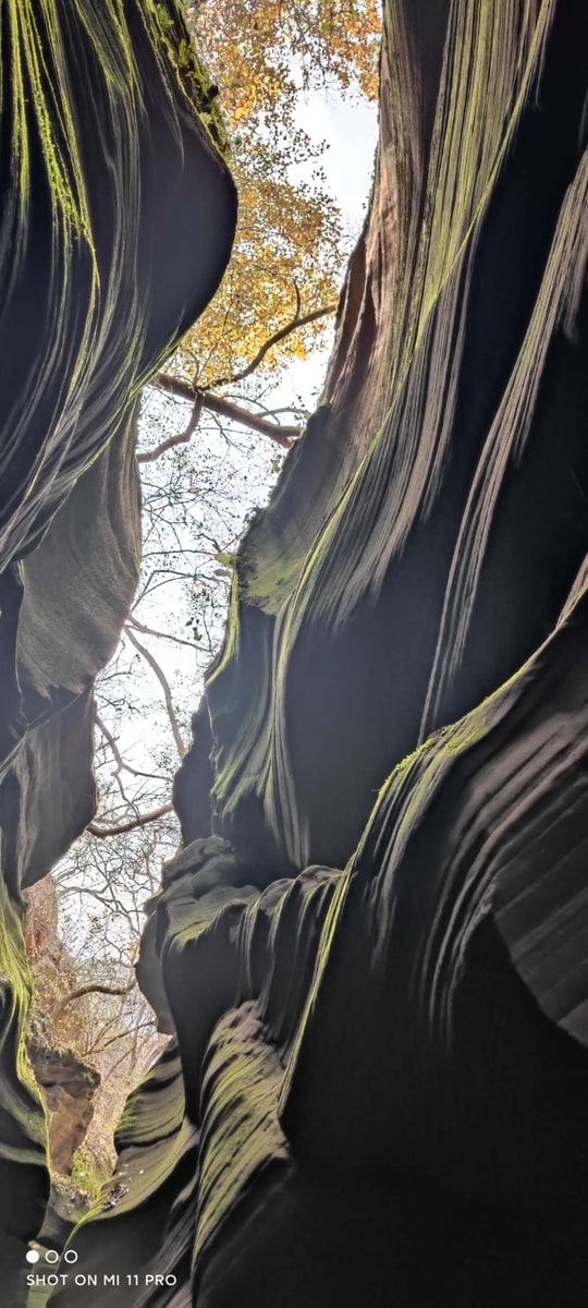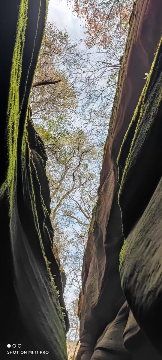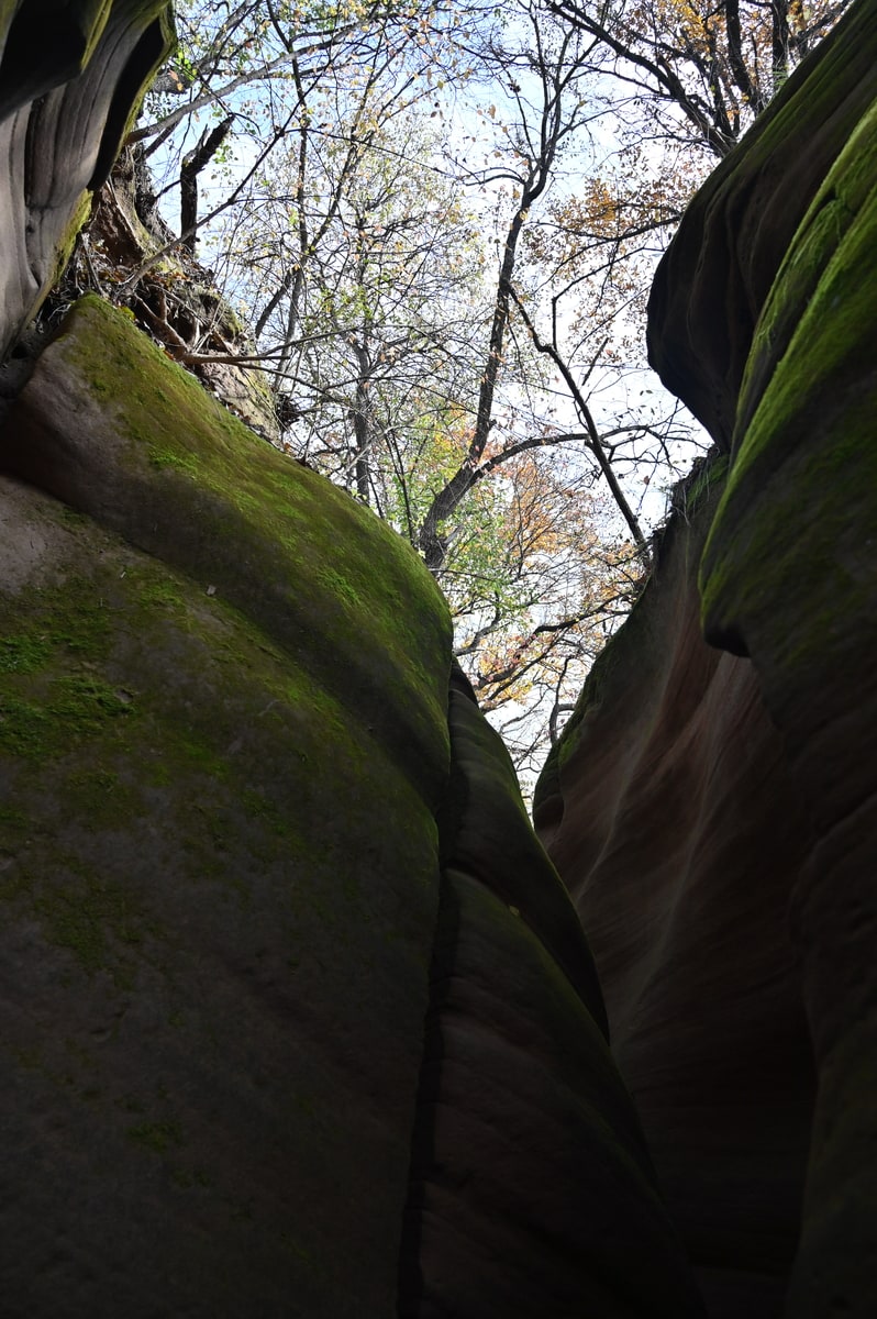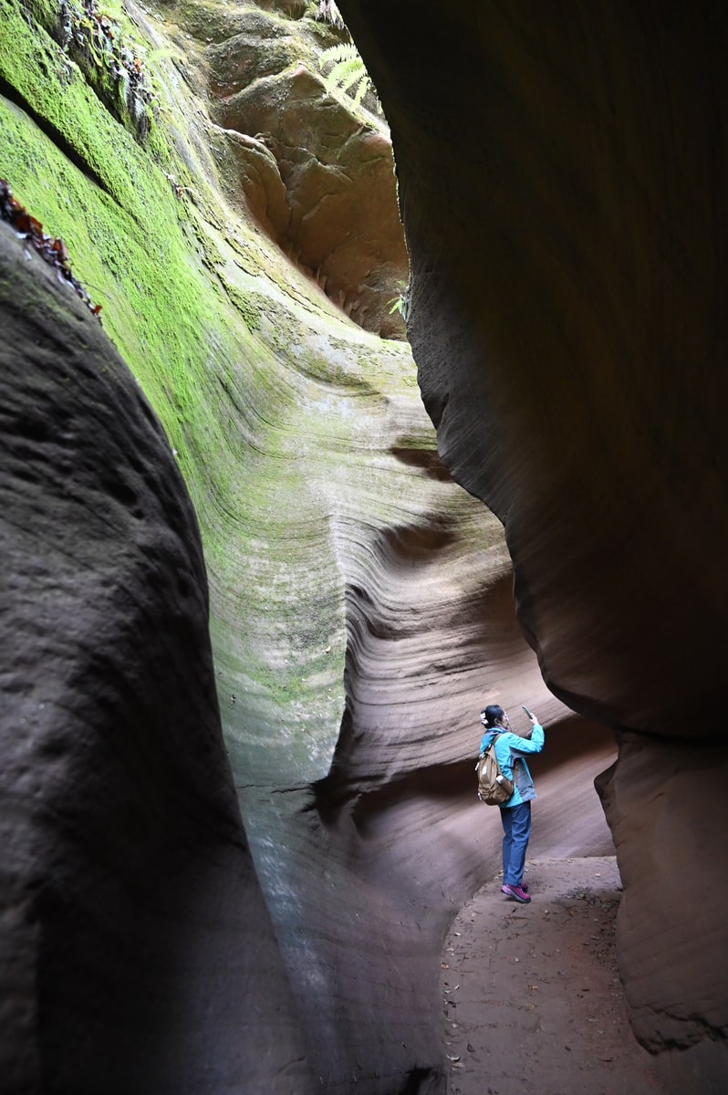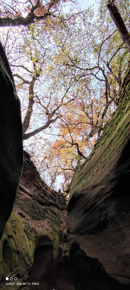 峡谷を訪れたのは秋たけなわの季節。峡谷を歩きながら空を見上げると、岩と岩の狭い隙間に紅葉の樹々が見えている。苔と線刻の岩、そして紅葉と青空。夢の中で回廊を彷徨っているような感覚に浸ることができた。