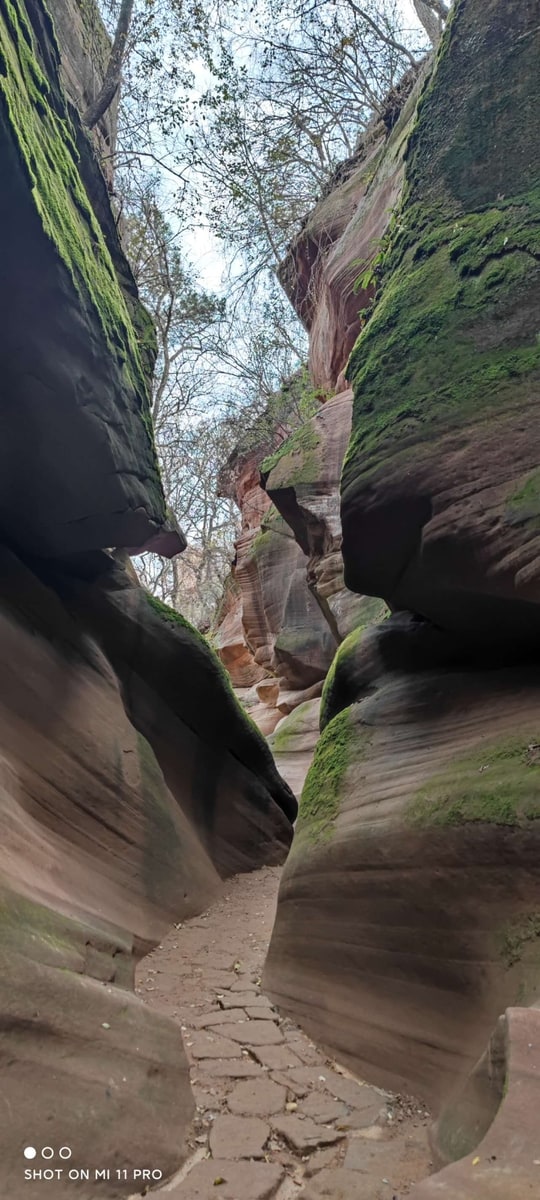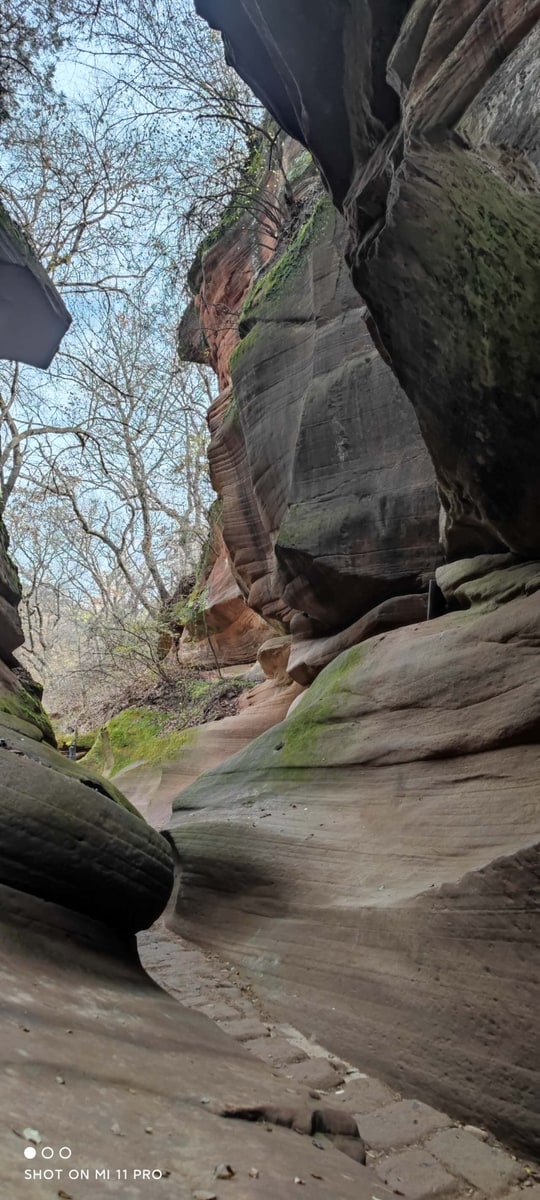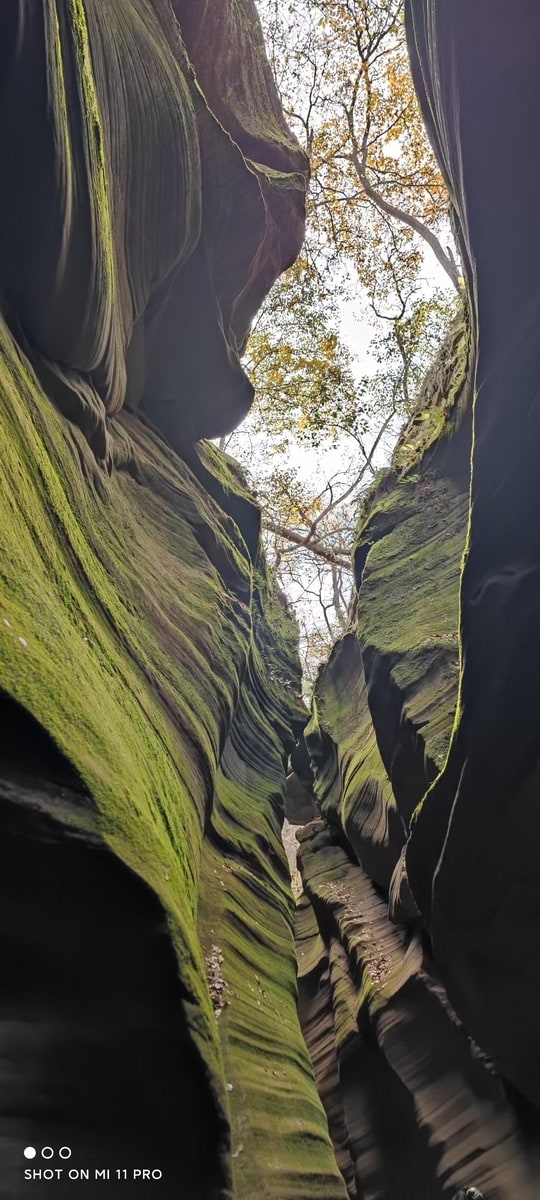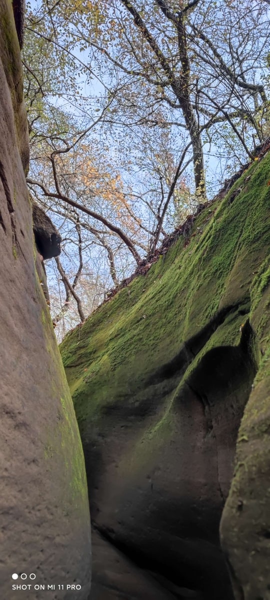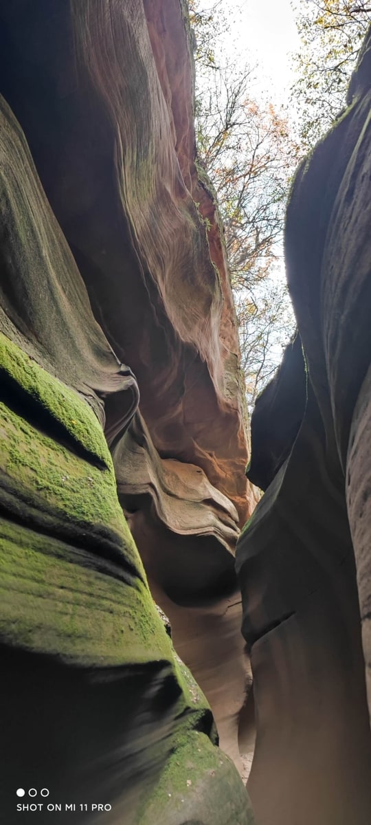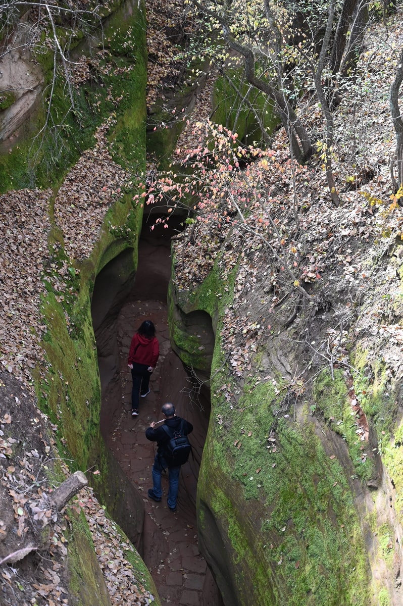 峡谷を訪れたのは秋たけなわの季節。峡谷を歩きながら空を見上げると、岩と岩の狭い隙間に紅葉の樹々が見えている。苔と線刻の岩、そして紅葉と青空。夢の中で回廊を彷徨っているような感覚に浸ることができた。